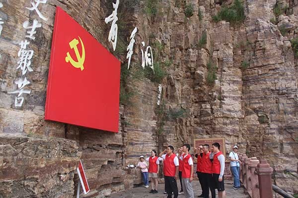 隨后,一行人前往青年洞,這是紅旗渠工程中的重要組成部分。在這里,面對鮮紅的黨旗,全體黨員莊重地重溫了入黨誓詞,在鏗鏘有力的誓言中,每位黨員的心靈得到了凈化與升華,仿佛與那段波瀾壯闊的歷史產(chǎn)生了跨越時空的共鳴。這不僅是一次簡單的宣誓,更是對紅旗渠精神的傳承與承諾,是對新時代使命的勇敢擔當。