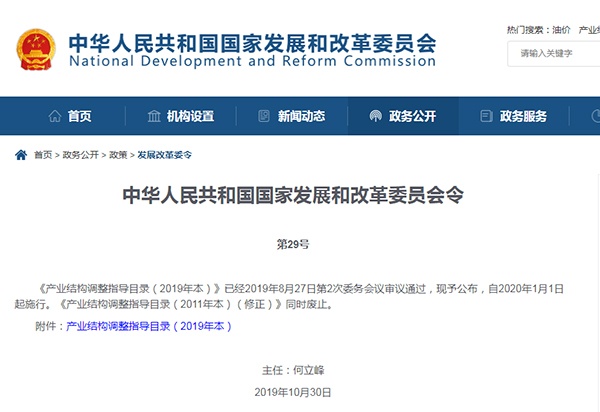 發改委發布《產業結構調整指導目錄(2019年本)》