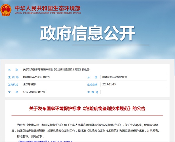 生態環境部關于發布國家環境保護標準《危險廢物鑒別技術規范》的公告