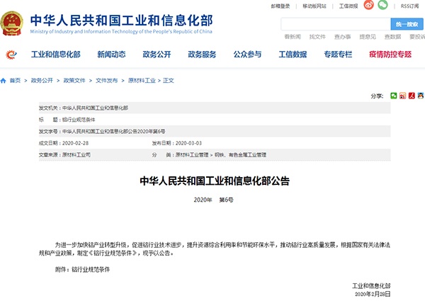 2020年3月3日,工業(yè)和信息化部發(fā)布了《鋁行業(yè)規(guī)范條件》,詳情如下: