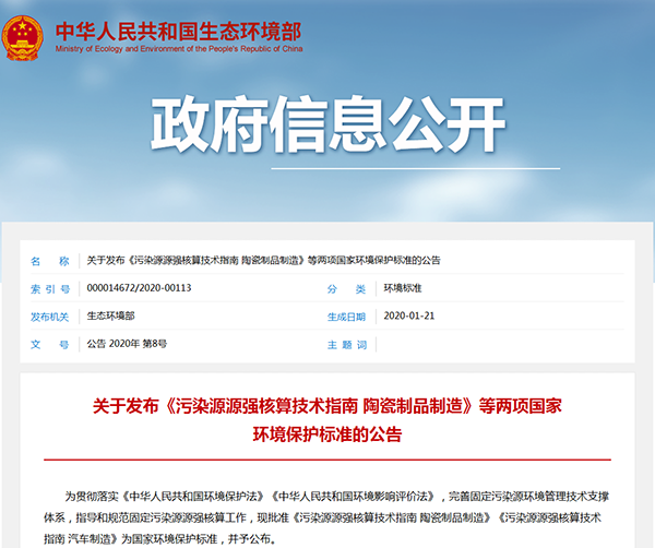 2020年1月21日,生態(tài)環(huán)境部發(fā)布了《污染源源強核算技術(shù)指南 陶瓷制品制造》《污染源源強核算技術(shù)指南 汽車制造》兩項國家環(huán)境保護標準,詳情如下: