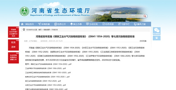轉發河南省發布實施《鋼鐵工業大氣污染物排放標準》(DB41 1954-2020)等七項污染物排放標準的通知