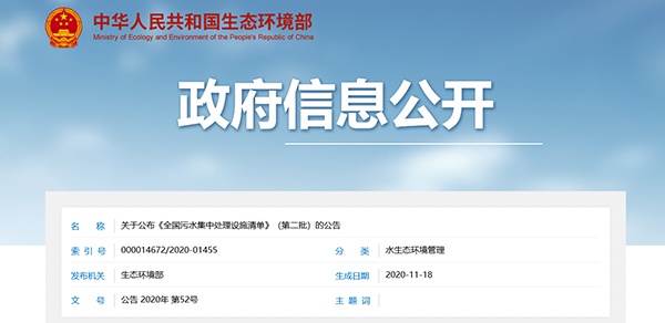 轉發(fā)生態(tài)環(huán)境部關于公布《全國污水集中處理設施清單》(第二批)的公告