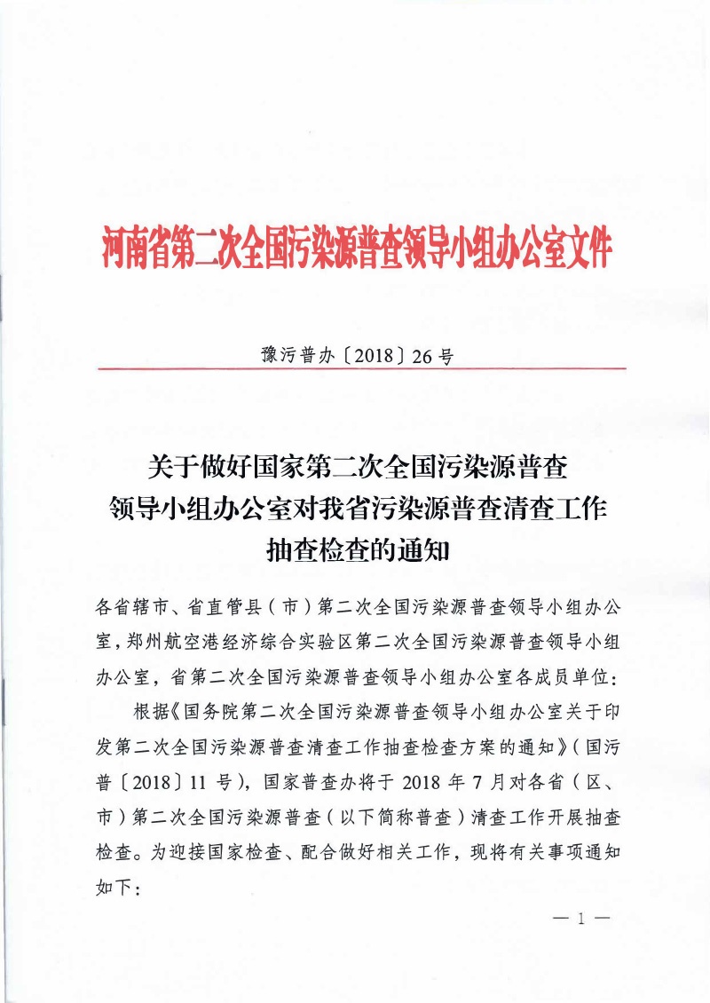 豫污普辦【2018】26號關于做好國家二污普領導小組辦公室對我省清查工作抽查檢查的通知